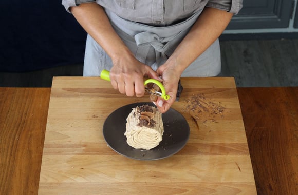 20A l'aide d'un couteau économe, faites des copeaux de chocolat noir et de pralinoise et décorez les mini bûches avec.