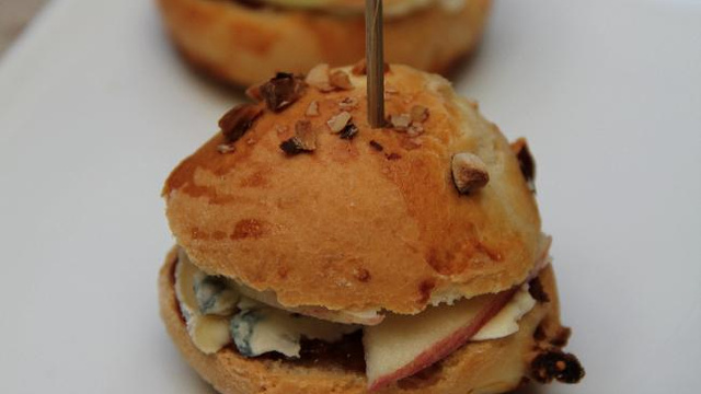Pour un apéritif dinatoire, des minis hamburgers à la fourme d' Ambert, aux chutney et à la pomme crue.