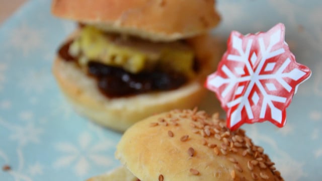 Des bouchées festives façon street food haut de gamme avec ces mini burgers au foie gras et confit d'oignon.