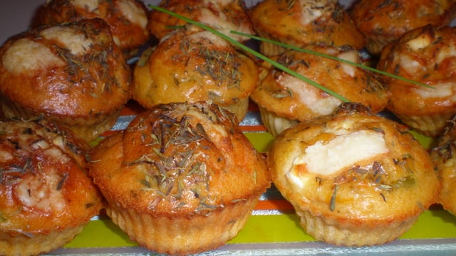 Dans des empreintes à mini muffins, verser la pâte et enfoncer un petit morceau de mozzarella au centre.