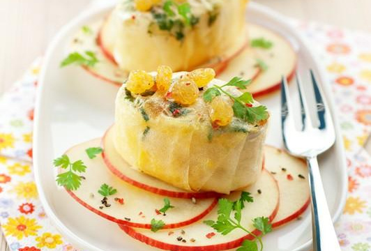 Disposer les rondelles de pomme sur assiette, déposer un 'mini Caprice' doré.