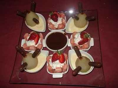 4. Pour le dressage, mettre un fond de glace vanille dans un récipient individuel, disposez la poire dessus. Pour le chocolat, utilisez des pipettes plastiques ou des petits pots.