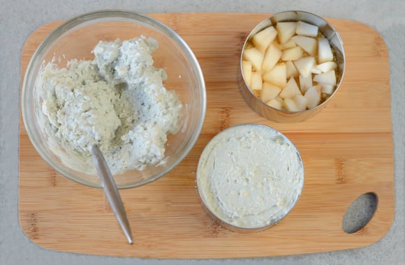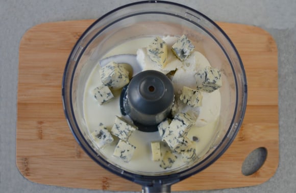 8Dans le bol de votre robot mixer, mettez la ricotta, les morceaux de Fourme d'Ambert et la crème à la gélatine. Mixez le tout.