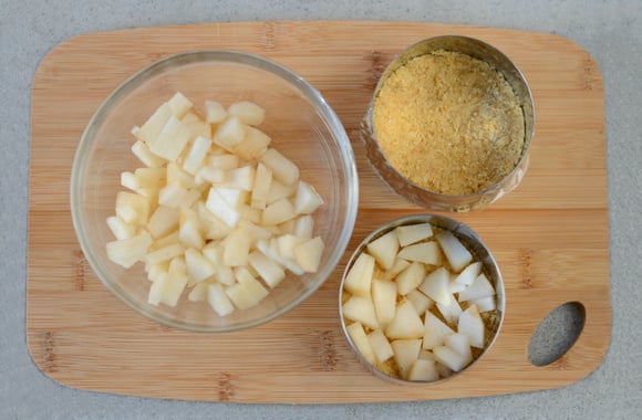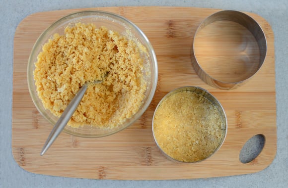 5Tassez la préparation dans 4 mini cercles hauts à pâtisserie de 8 cm de diamètre.
