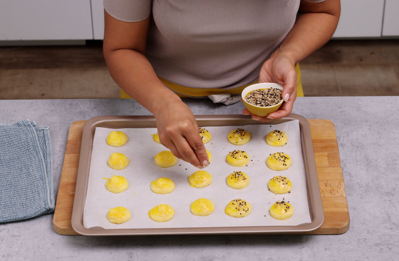 5Badigeonnez les choux de jaune d’œuf battu et saupoudrez-les de graines de sésame puis enfournez-les 30 min sans ouvrir le four.