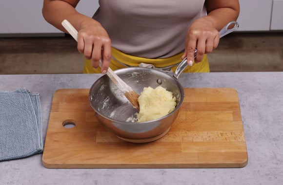 2Retirez du feu et versez la farine en une seule fois et hors du feu mélangez vigoureusement avec une cuillère en bois jusqu’à ce que la pâte se détache des parois de la casserole.