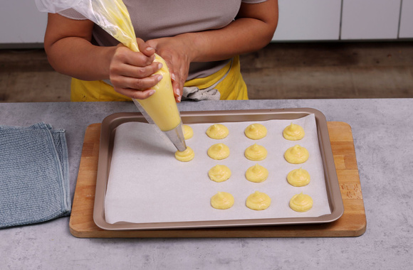 4Dressez des choux de 4 cm de diamètre à l’aide d’une poche à douille lisse sur du papier sulfurisé.