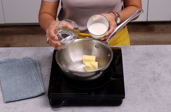 Dans une casserole faites chauffer l’eau, le lait, le sel, le sucre et le beurre en morceaux. Portez à ébullition.