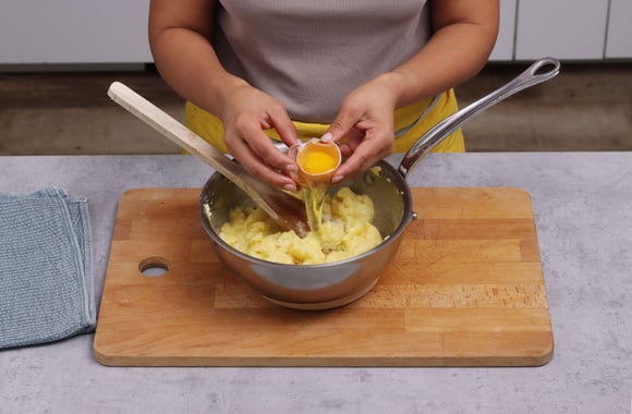 3Laissez reposer 5 minutes puis incorporez les oeufs un à un, mélangez à l’aide d’un fouet jusqu’à complète absorption.