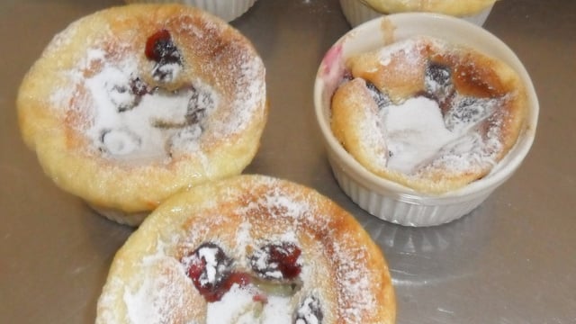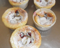 Mélangez la farine et le sucre, ajoutez les oeufs. Incorporez le lait et la crème petit a petit. Répartissez le mélange dans les ramequins, puis ajoutez les fruits.