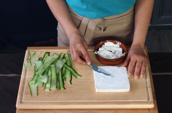 5Déposez les lamelles de concombre sur le fromage, horizontalement.