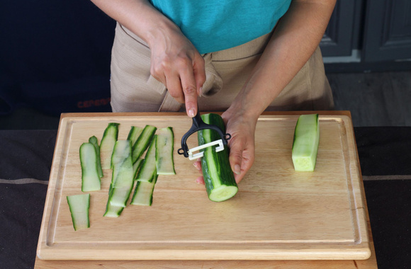 1Pelez le concombre puis détaillez-le en très fines lanières à l'aide d'une mandoline ou d'un rasoir à légumes.