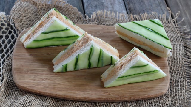 12Coupez chaque sandwich en quatre, afin d'obtenir 4 triangles. Vous allez obtenir 8 mini-sandwichs.