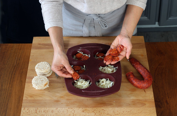 7Ajoutez 4 rondelles de chorizo au dessus du fromage.