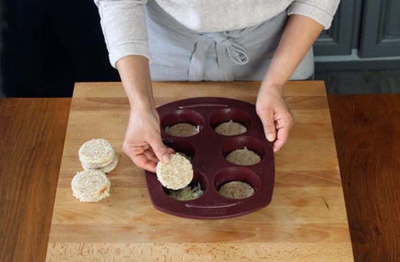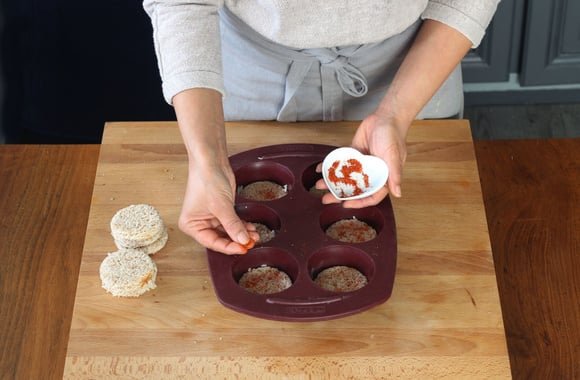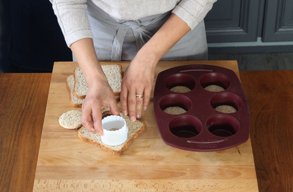 Détaillez les tranches de pain de mie en rond avec un emporte pièce de la taille de vos moules à muffin.