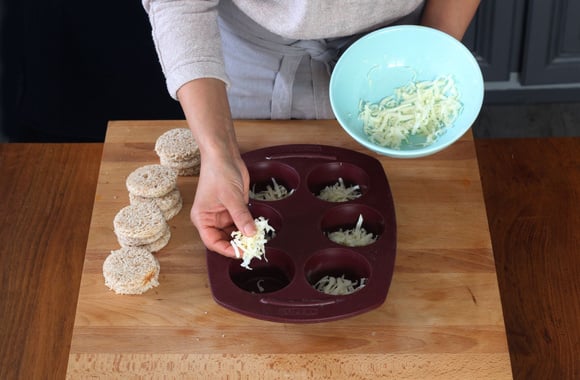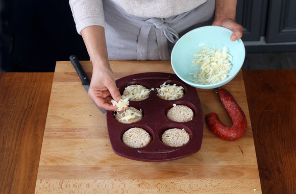 3Saupoudrez de fromage râpé le fond de chaque moule.