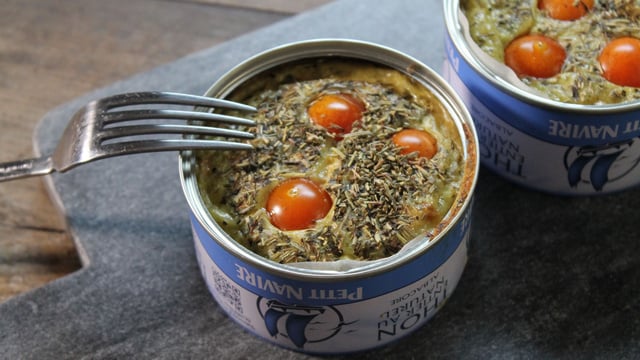 Répartissez le mélange dans 2 boîtes de thon recouvert de papier sulfurisé : cercle + bande, déposez 3 tomates cerises sur le dessus. Parsemez avec des herbes de Provence et enfournez pour une vingtaine de minutes dans un four préchauffé à 180°C.