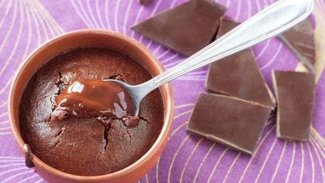 Beurrer 4 ramequins en aluminium et y verser la préparation. Mettre au four à 180°C pendant 10 min.