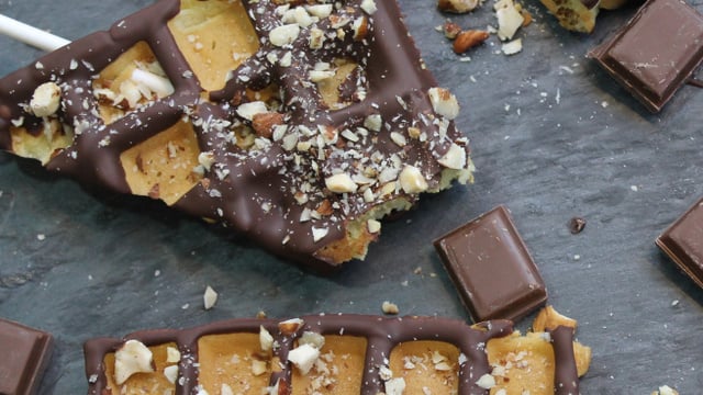 Tremper une petite partie de la gaufre dans le chocolat fondu et parsemer de noisettes concassées.