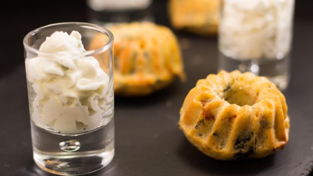 Servir un mini kouglof accompagné d'une verrine à la chantilly au roquefort.