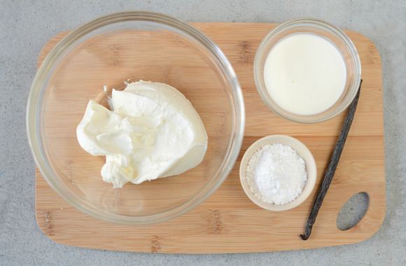 5Dans un saladier, mettez le mascarpone, le sucre glace, les graines de vanille et la crème.