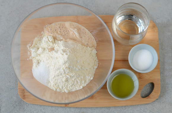 1Dans un saladier, versez la farine, l’eau, la levure boulangère, le sel, l’huile d’olive et le sucre.