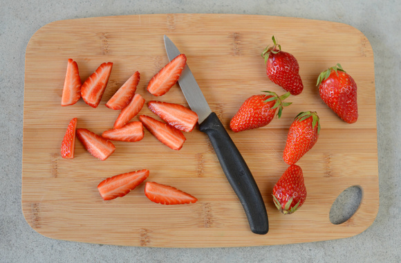 8Lavez, équeutez et coupez les Fraises du Périgord IGP en quatre.