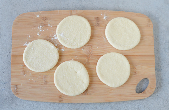 4Farinez le plan de travail et étalez la pâte et coupez 12 cercles de 10 cm de diamètre.