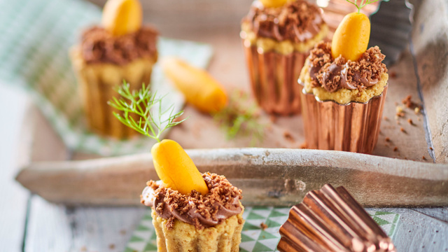 Une fois la mousse au chocolat prise, démouler les cups de Galettes Bretonnes KER CADELAC© et les remplir de mousse au chocolat. Émietter quelques parts de Moelleux Chocolat KER CADELAC© par-dessus et déposer une mini carotte sur chaque cup.