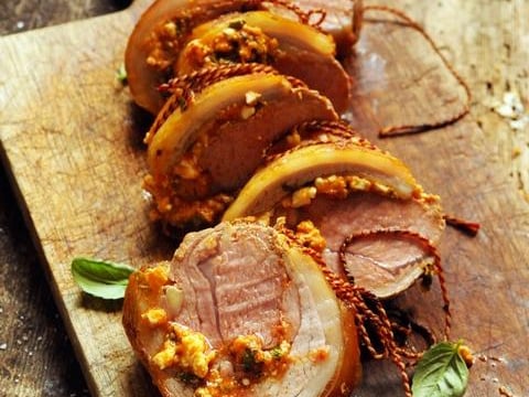 Etalez cette pâte sur la viande, roulez et ficelez. Mettez sur un plat, ajoutez un filet d'huile d'olive, salez et poivrez.