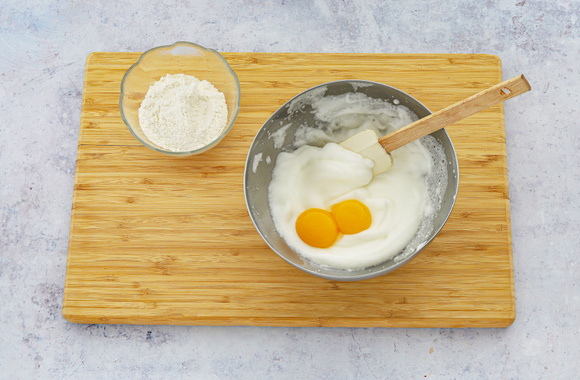 Versez les jaunes d’œufs, le zeste de citron râpé puis mélangez délicatement avec une maryse.