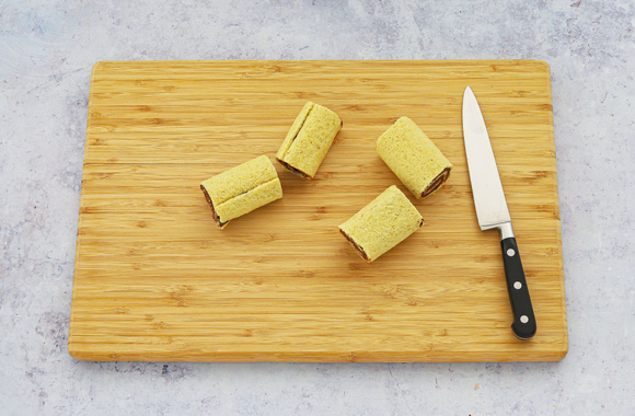 9Coupez avec un grand couteau afin d'obtenir des mini-roulés de la même taille. Dégustez après 10 minutes de repos à température ambiante.