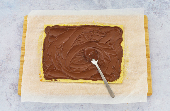 Décollez délicatement la génoise de sa feuille de papier sulfurisé, éventuellement en vous aidant avec une spatule. Étalez la ganache sur la génoise, en une fine couche régulière.