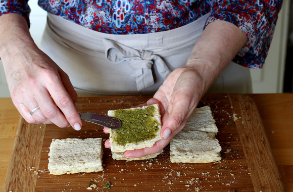 Pour les 4 premiers sandwichs, étalez le pesto sur les 4 tranches du dessous.