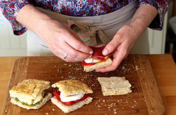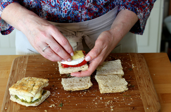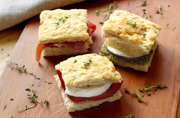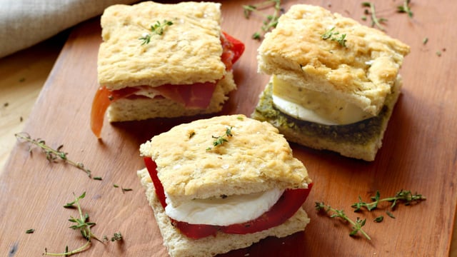 Fendez chaque carré de foccacia en deux.