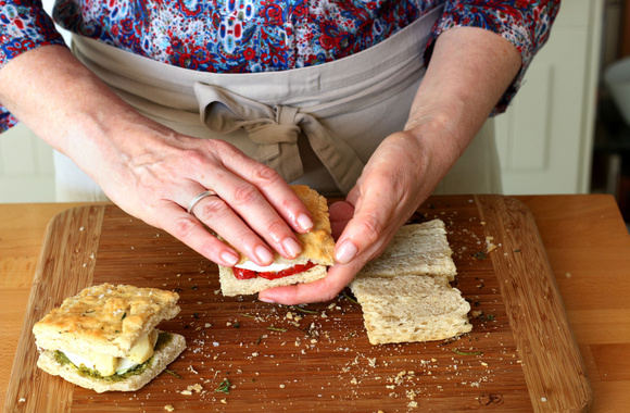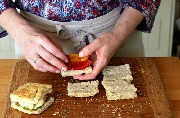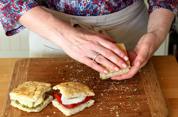 Fermez le sandwich et faites de même pour les 3 autres au poivron, mozzarella et artichaut.