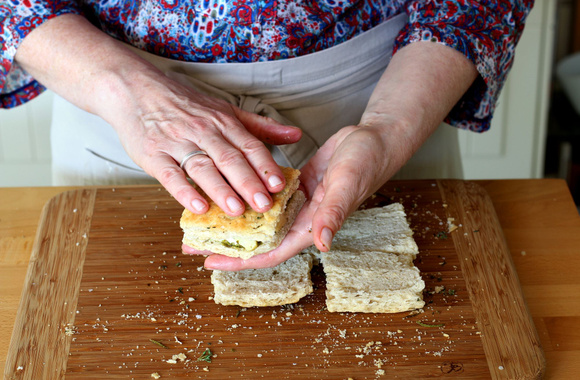 Coupez la foccacia en une douzaine de carrés de 8 cm de coté.