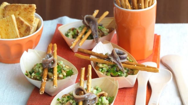 Mélangez et proposez dans des petites coupelles accompagnées de bretzels.
