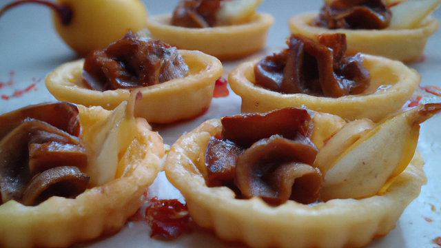Des fonds de tartelettes en pâte sablée garnie de Nutella et de cubes de poires, le tout accompagné d'une tuile de Carambar.