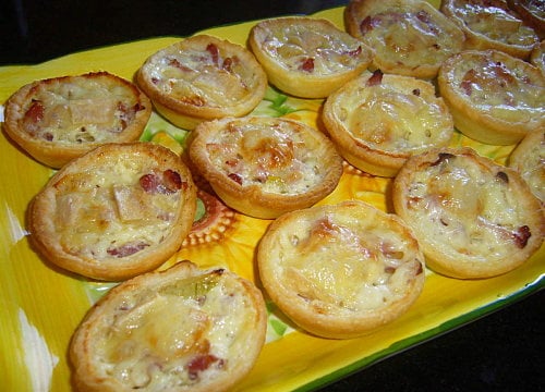 Disposer les rondelles de pâte sur chaque empreinte de tartelette puis les garnir avec un peu du mélange oignons/lardons. Ajouter juste un peu crème fraîche puis un petit morceau de fromage St Nectaire sur le dessus de chaque mini-tartelette.
