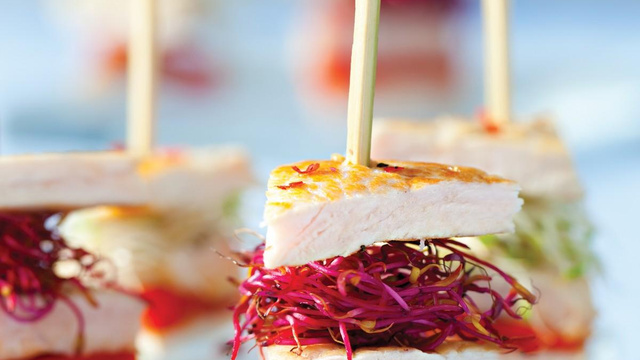 Sur une planche à découper, poser une escalope de dinde puis disposer une couche de poivrons, une autre escalope de dinde, une couche de pousses de betterave et finir par une escalope de dinde.