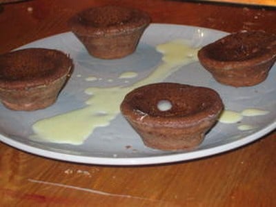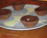 Remplir au deux tiers les moules,préalablement graissés avec du beurre et recouverts d'une pellicule de farine, et mettre au four à 180°C 6 minutes