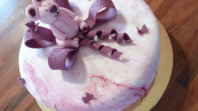 Suivant la hauteur et la taille du moule, réaliser 2 gâteaux identiques ( c'est ce que j'ai fait). Gâteau moelleux avec au milieu un coulis de framboises (congelées ou fraîches). Le tout recouvert de Pâte à sucre ....