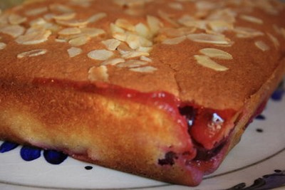 * Verser la préparation sur les quetsches, lisser et parsemer d'amandes effilées.