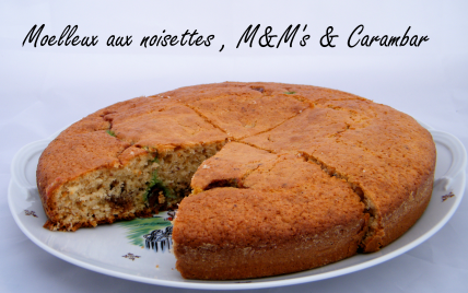 Mélanger les ingrédients secs : poudre de noisettes, farine, levure chimique, 1 pincée de sel et de bicarbonate . Ajouter les carambars et les M&M's, versez le tout dans le mélange liquide , remuez brièvement , versez la pâte dans un moule à manquer beurré et fariné ou en silicone et enfournez pour environ 25 minutes à 180°C ( Vérifiez la cuisson en plantant la lame d'un couteau au centre si elle ressort sèche c'est qu'il est cuit ).