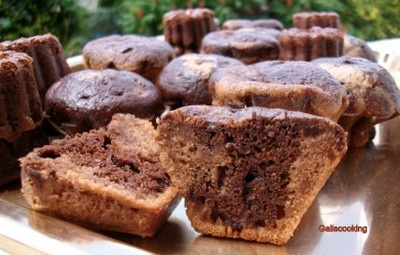 Dans la première partie, ajouter le chocolat fondu et dans la seconde, la pralinoise fondue. Mélanger les 2 préparations. Dans des moules à muffins en papier ou en silicone, alterner les 2 préparations, comme pour un marbré. Enfourner pour 15 minutes environ.