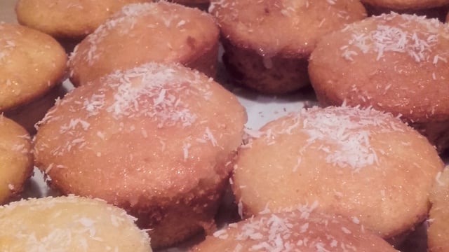 Huilez et farinez vos moules et mettez votre préparation. Dans les moules à muffins faîtes cuire 20 minutes à 180°C, si vous optez pour un grand moule il vous faudra prolongez la cuisson. Sortez et laissez refroidir avant de démouler. Vous pouvez les nappez d'un peu de glaçage citron/sucre et de noix de coco.