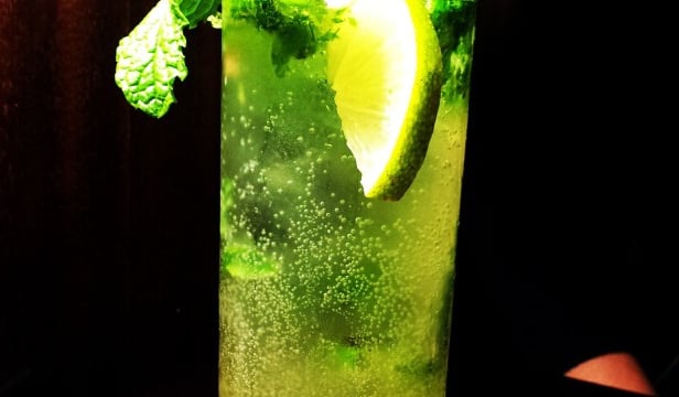 Au pilon, écraser les feuilles de menthe, les mettre dans les verres, ajouter le contenu du bol et finir avec la glace pilée.