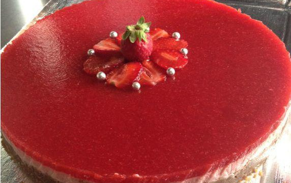 Le lendemain, découper 2 fraises en tranches et les diposer en rosace, décorer avec des perles de sucre ou selon votre goût.