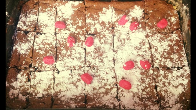 Versez un peu de sucre glace sur le brownie et quelques fraises Tagada.